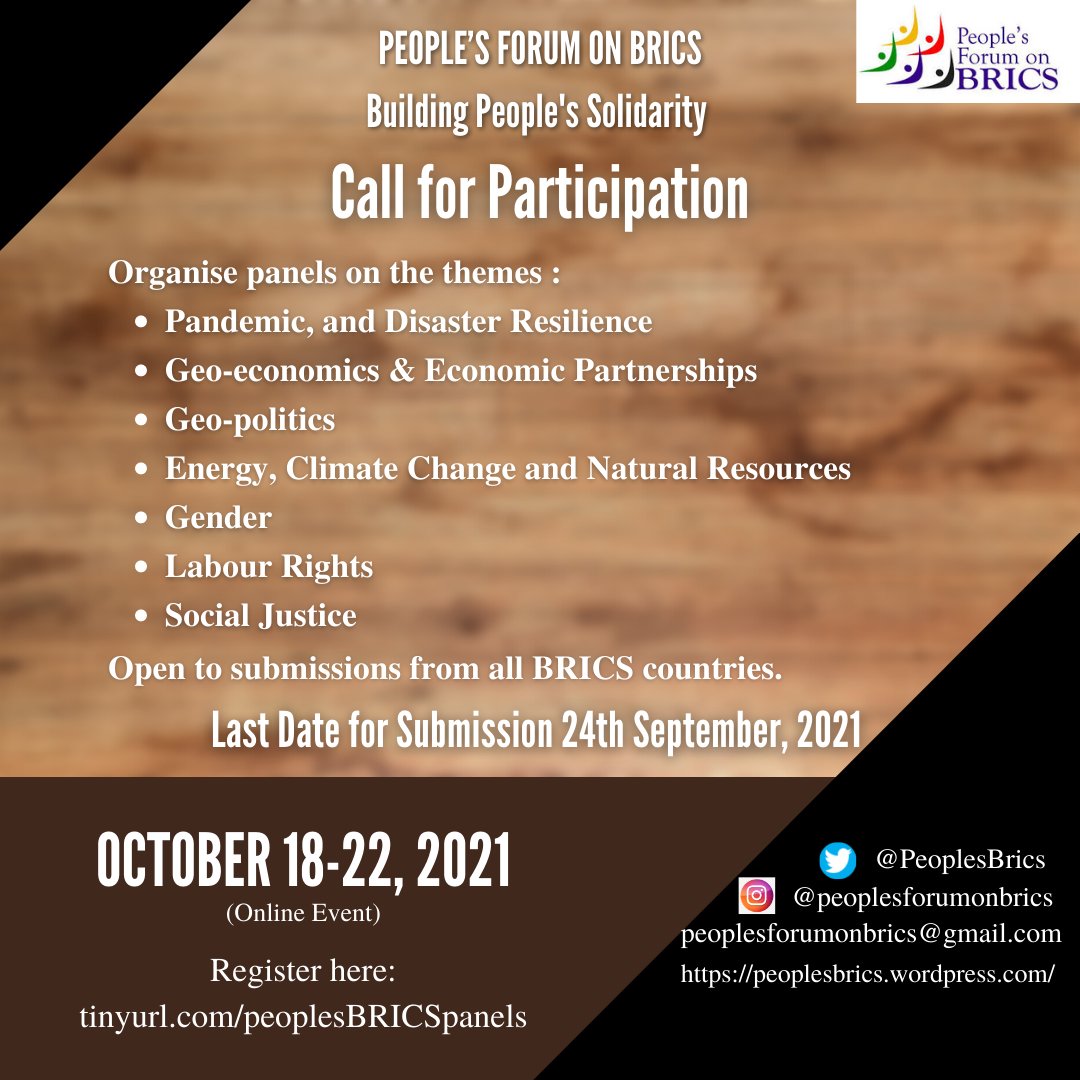 Please submit your proposal or expression of interest to hold panels under the aegis/banner of People’s BRICS Forum 2021 either individually or as a collective of organisations.
