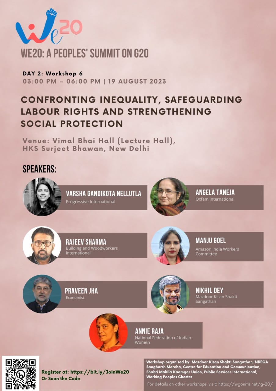 Speakers: Varsha Gandikota Nellutla, Progressive International, Angela Taneja, Oxfam International, Rajeev Sharma, Building and Woodworkers International, Manju Goel, Amazon India Workers Committee, Praveen Jha, Economist, Nikhil Dey, Mazdoor Kisan Shakti Sangathan, Annie Raja, National Federation of Indian Women